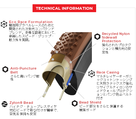 コンパウンドはグラベルレースのために新開発された『Eco Race Formulation』が採用されている。素材は『*フェアラバー認証』を受けた天然ゴムに、大豆油を加えることでゴムのひび割れリスクを低減。さらにもみ殻灰シリカを組み合わせることで、グリップ力と転がり抵抗を高めています。